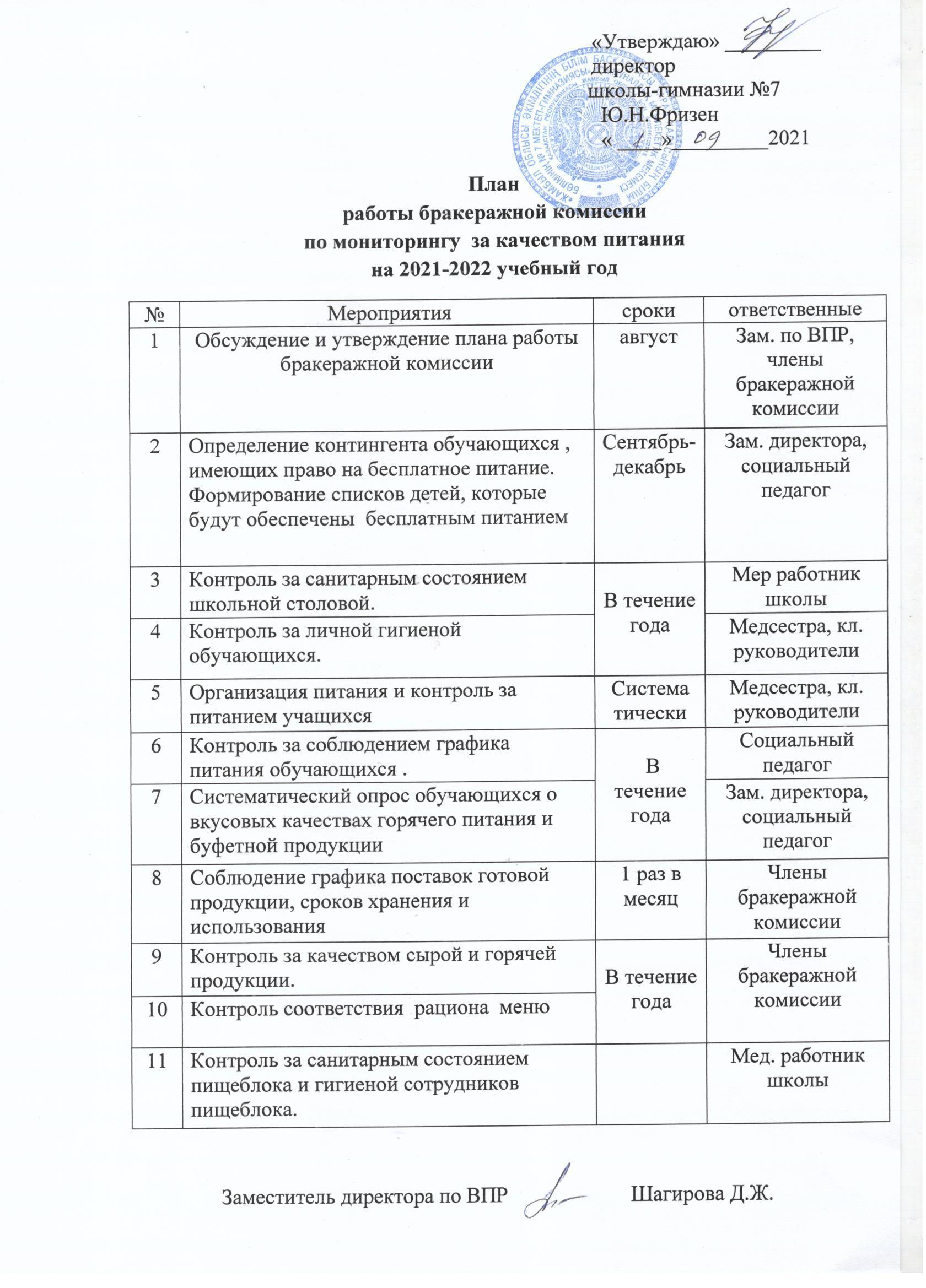 План бракеражной комиссии » Школа-гимназия №7 г. Тараз - официальный сайт