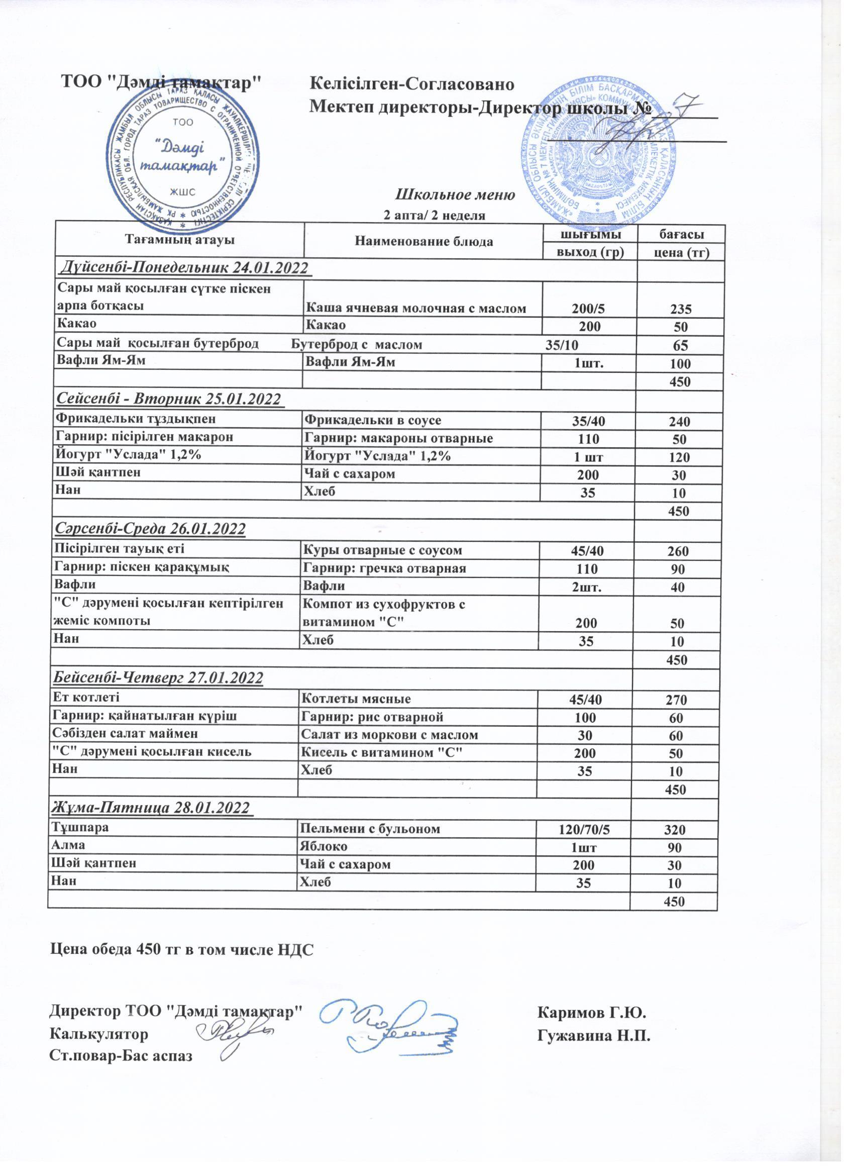 Недельное питание с 24.01.2022 по 28.01.2022 » Школа-гимназия №7 г. Тараз - официальный сайт