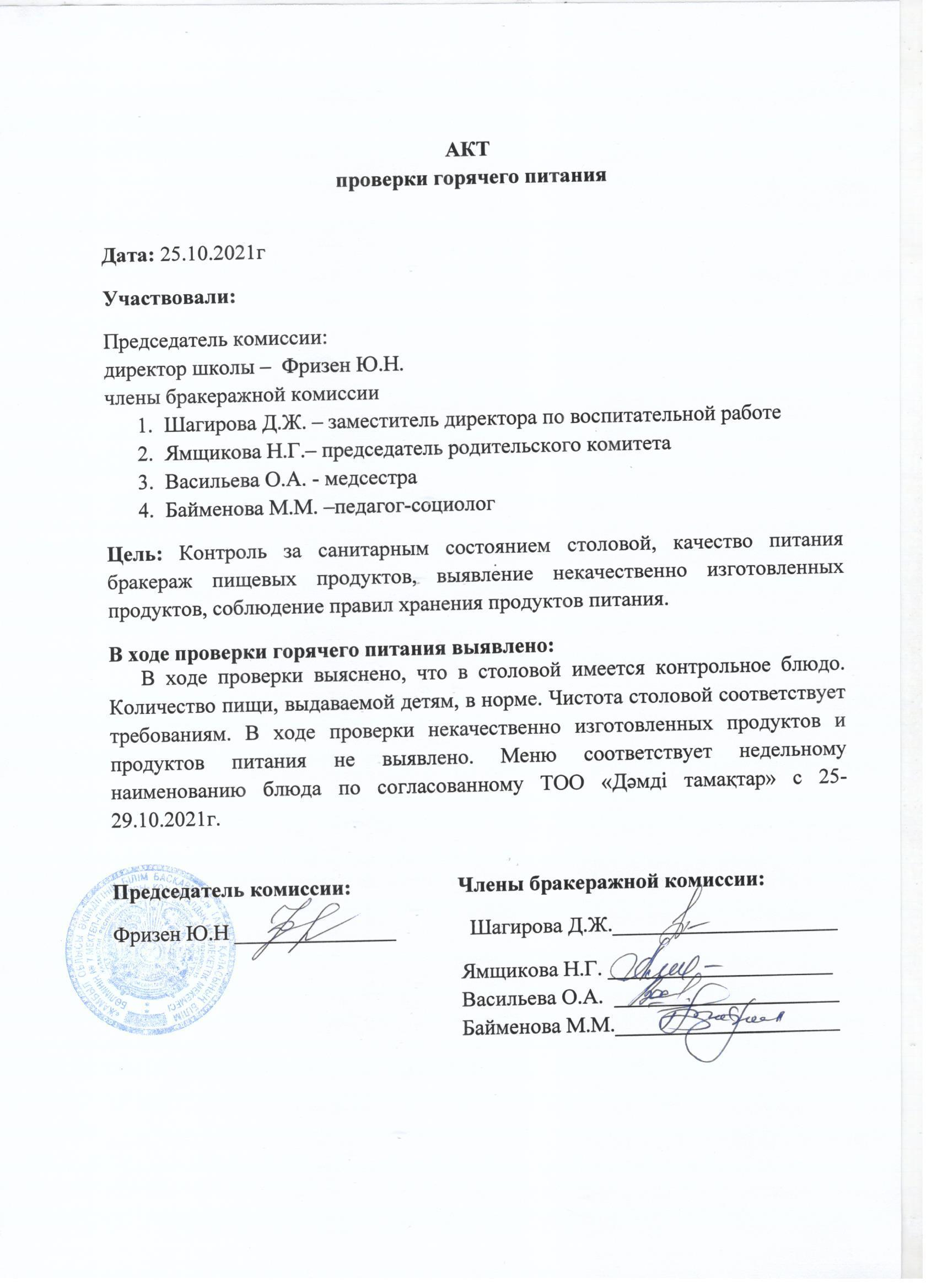 АКТ проверки горячего питания » Школа-гимназия №7 г. Тараз - официальный сайт