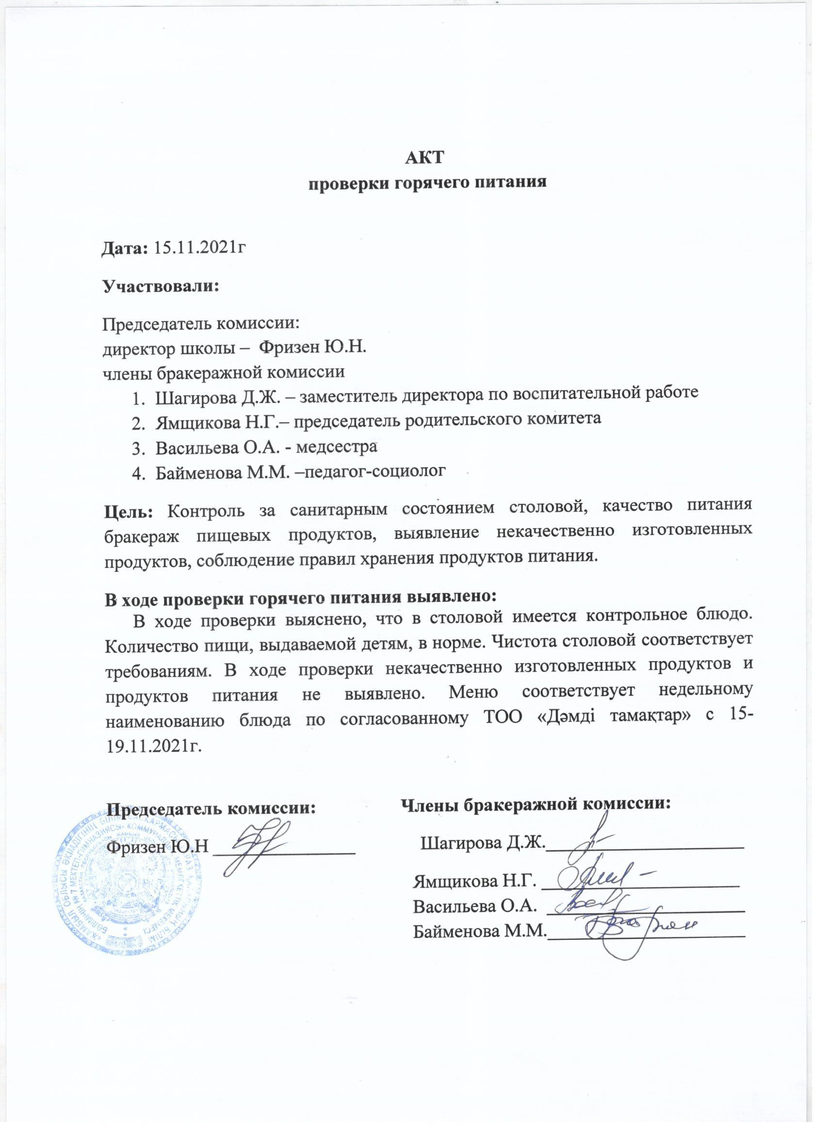 АКТ проверки горячего питания » Школа-гимназия №7 г. Тараз - официальный сайт