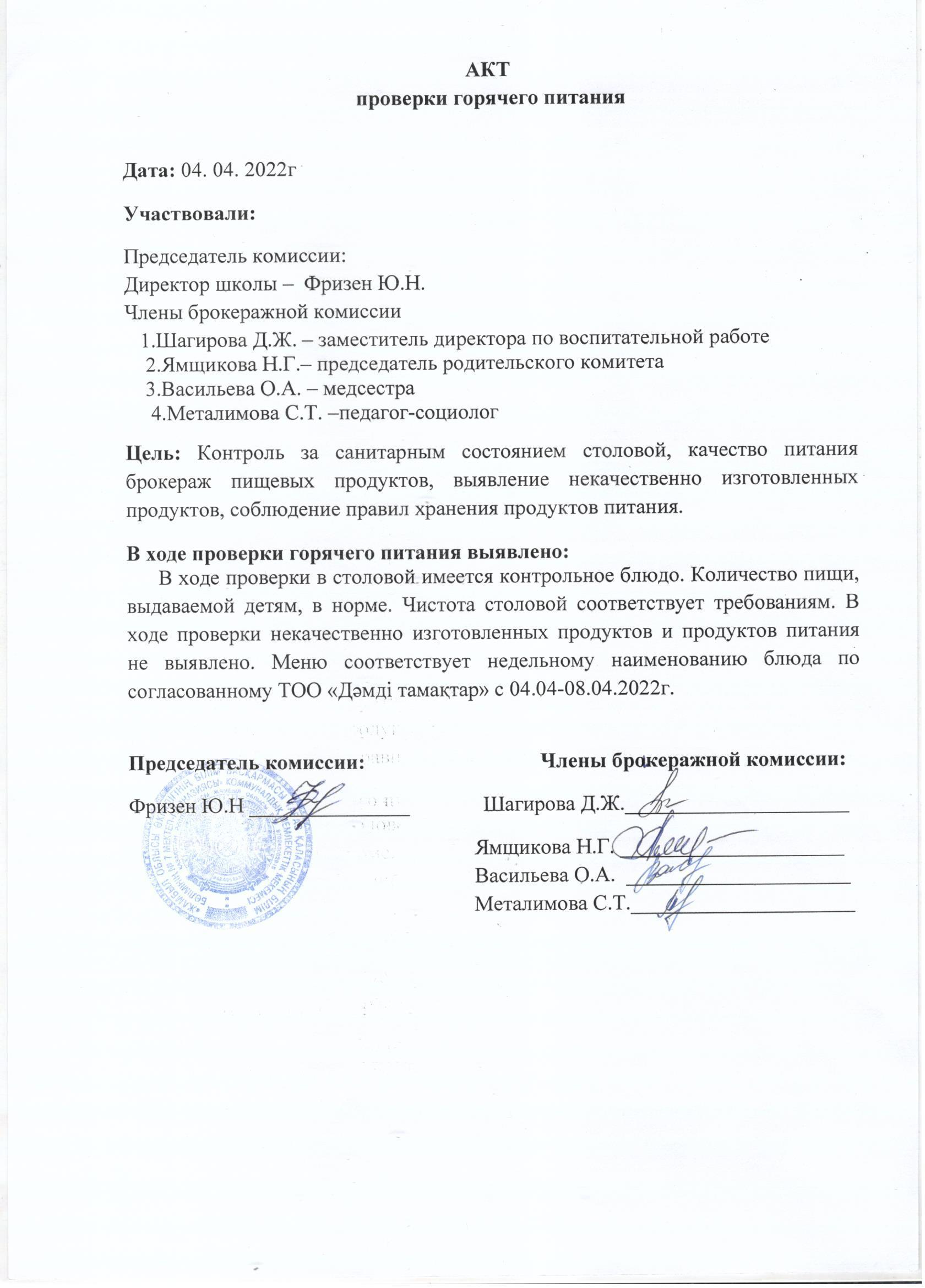 АКТ проверки горячего питания » Школа-гимназия №7 г. Тараз - официальный сайт